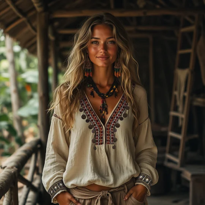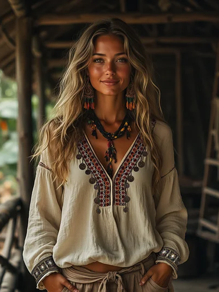Casual Ethnic Style Embroidered Linen Round Neck Long Sleeve Shirt