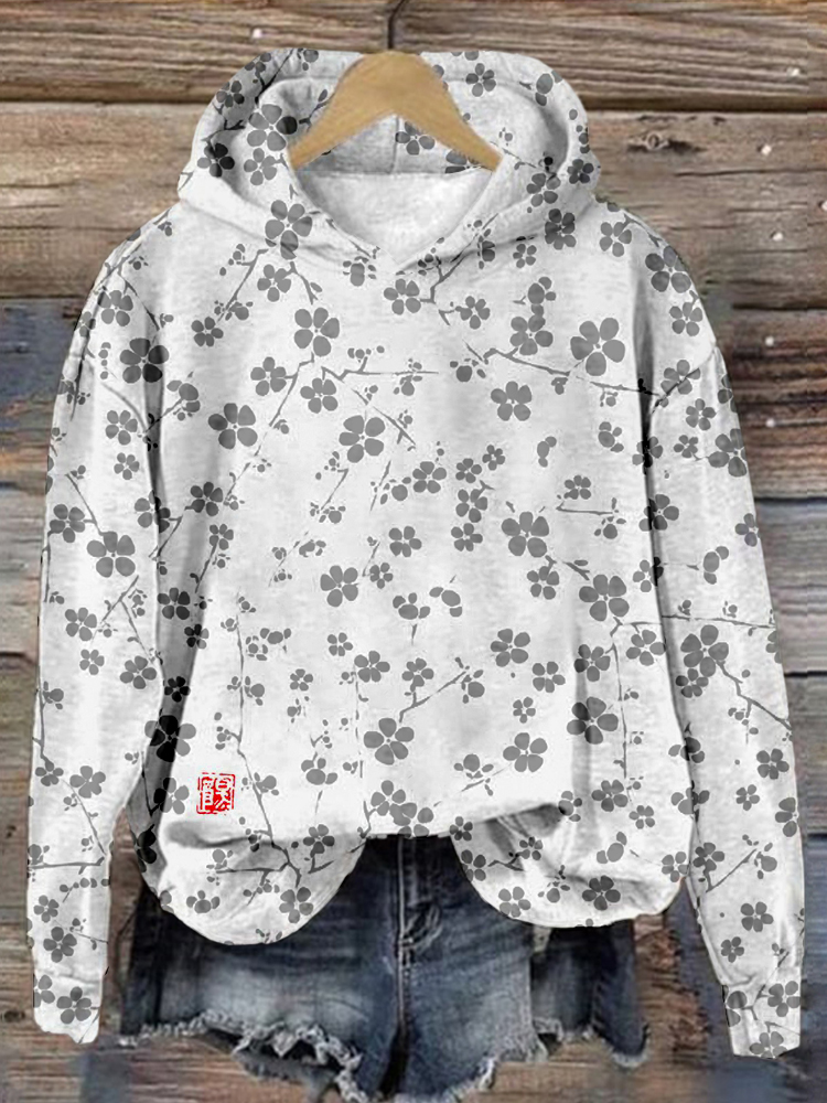 Cherry Blossom Japanese Lino Art Vintage Cozy Hoodie
