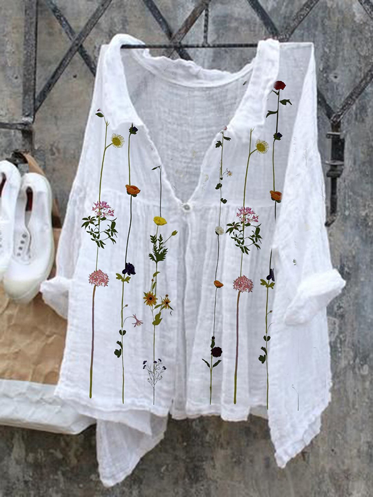 Floral Pattern Ladies Casual Floral Print Cotton Linen Shirt
