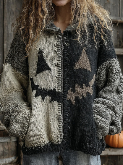 Halloween Pumpkin Face Patchwork Art Cozy Knit Hooded Cardigan