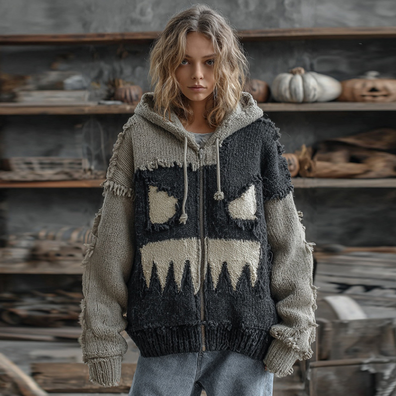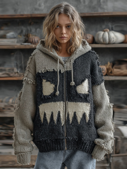 Halloween Pumpkin Face Patchwork Art Cozy Knit Hooded Cardigan