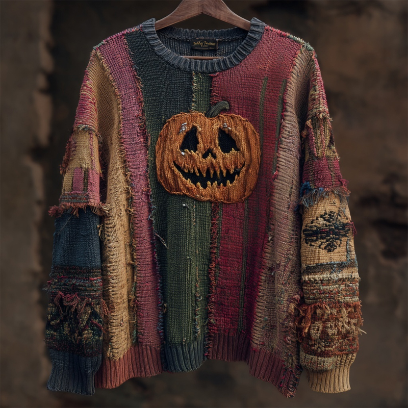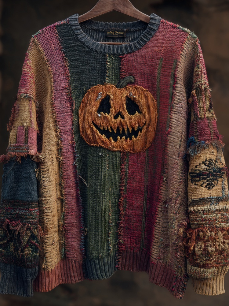 Halloween Spooky Pumpkin Face Embroidered Patchwork Knitted Sweater