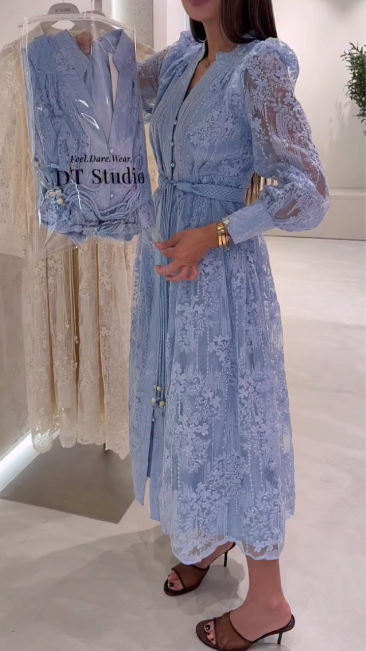 2. Design: The stand-up collar and deep V-neck design flatter the shoulders and neck, creating a look that is both gentle and sexy. Puff sleeves with delicate button embellishments add a touch of French vintage style. The woven rope tie at the waist allows for adjustable fit to create a slimmer silhouette. The all-over three-dimensional floral embroidery adds detail and a sophisticated feel.