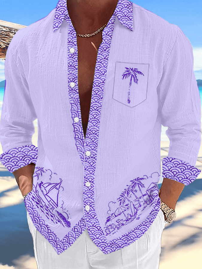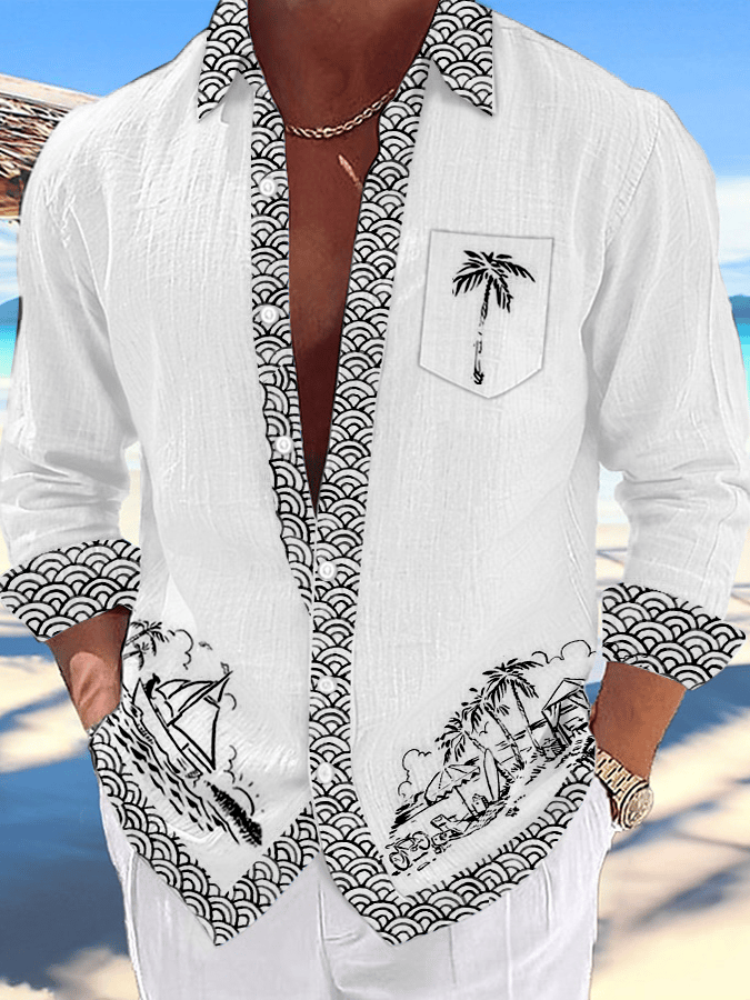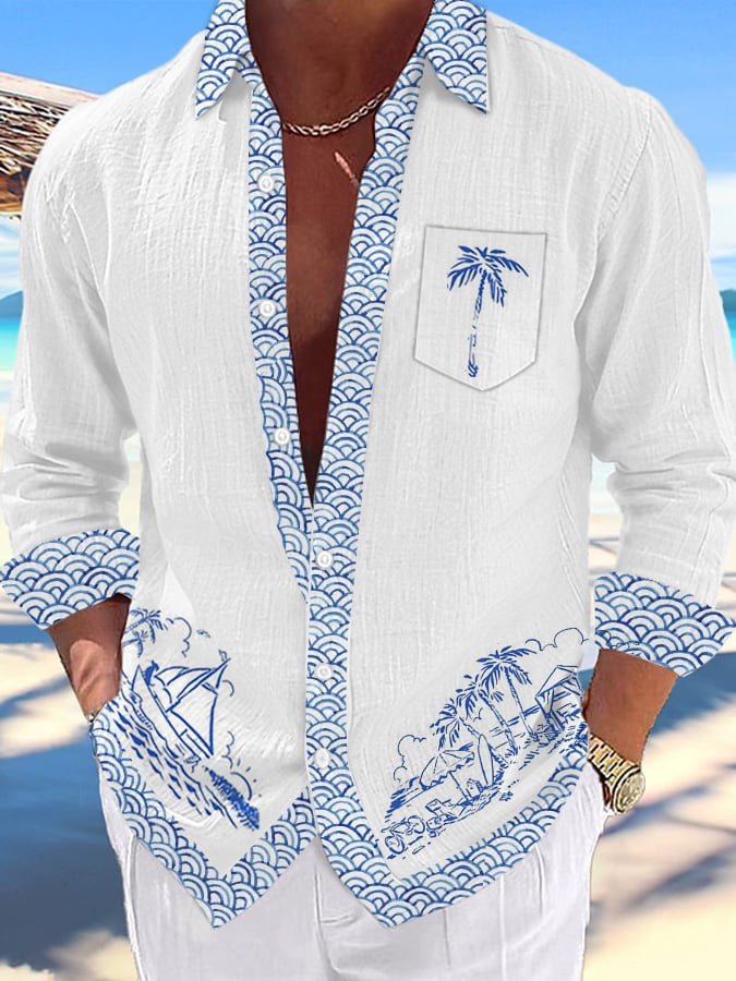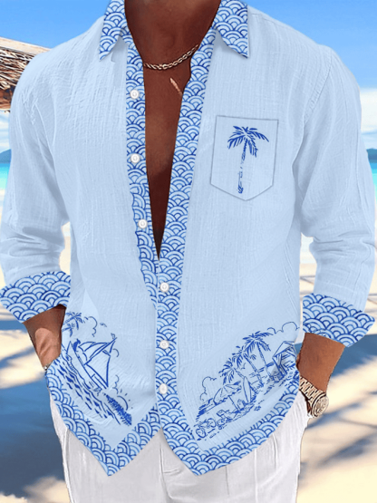Men's Artistic Vacation Printed Long Sleeve Shirt (With Pockets)