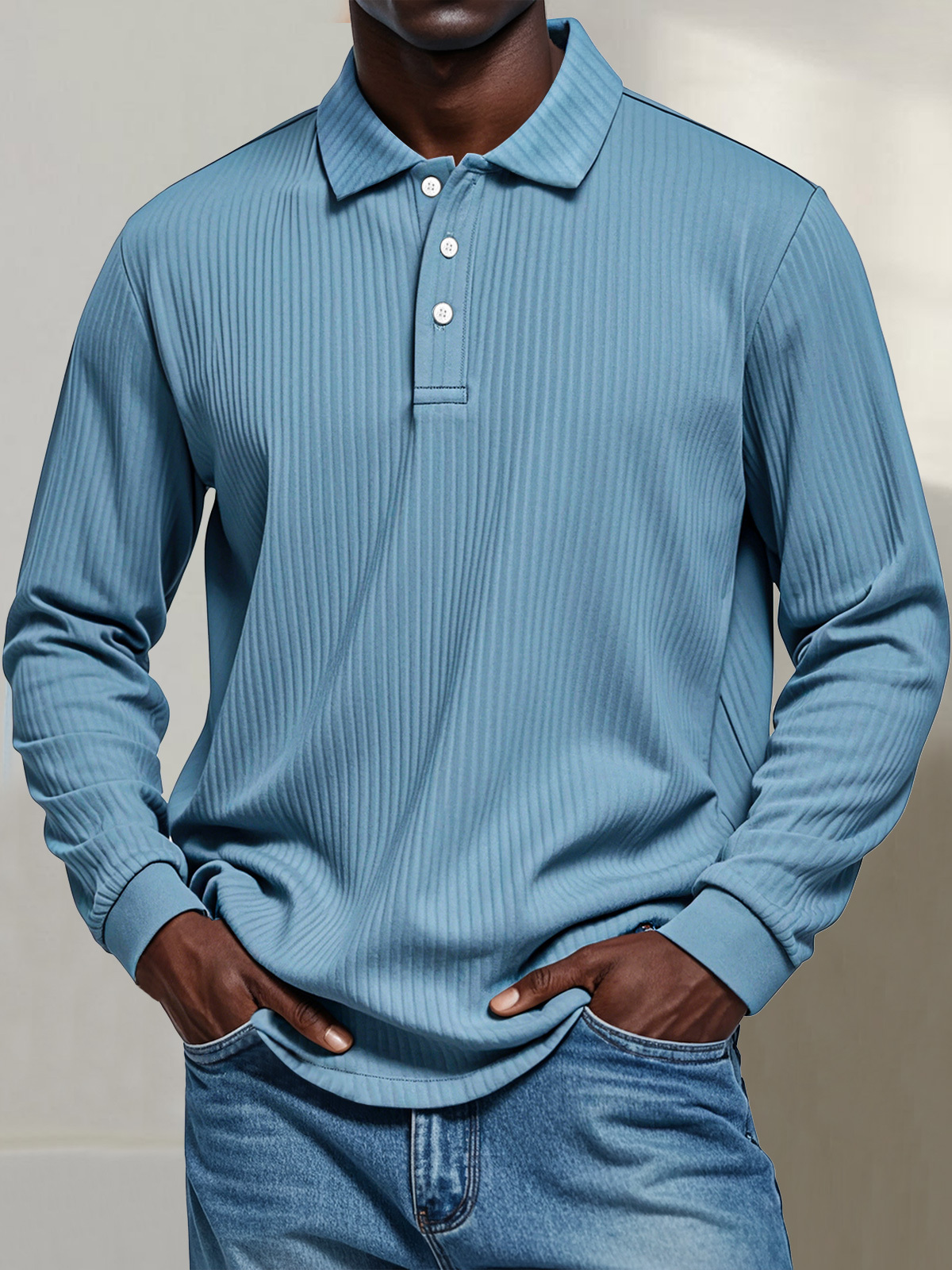 Men's Pit Texture Casual Button Solid Color Long-sleeved Polo Shirt