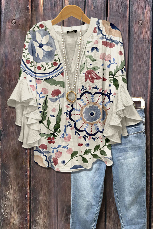 Multi Floral Print Ruffle Sleeve Top