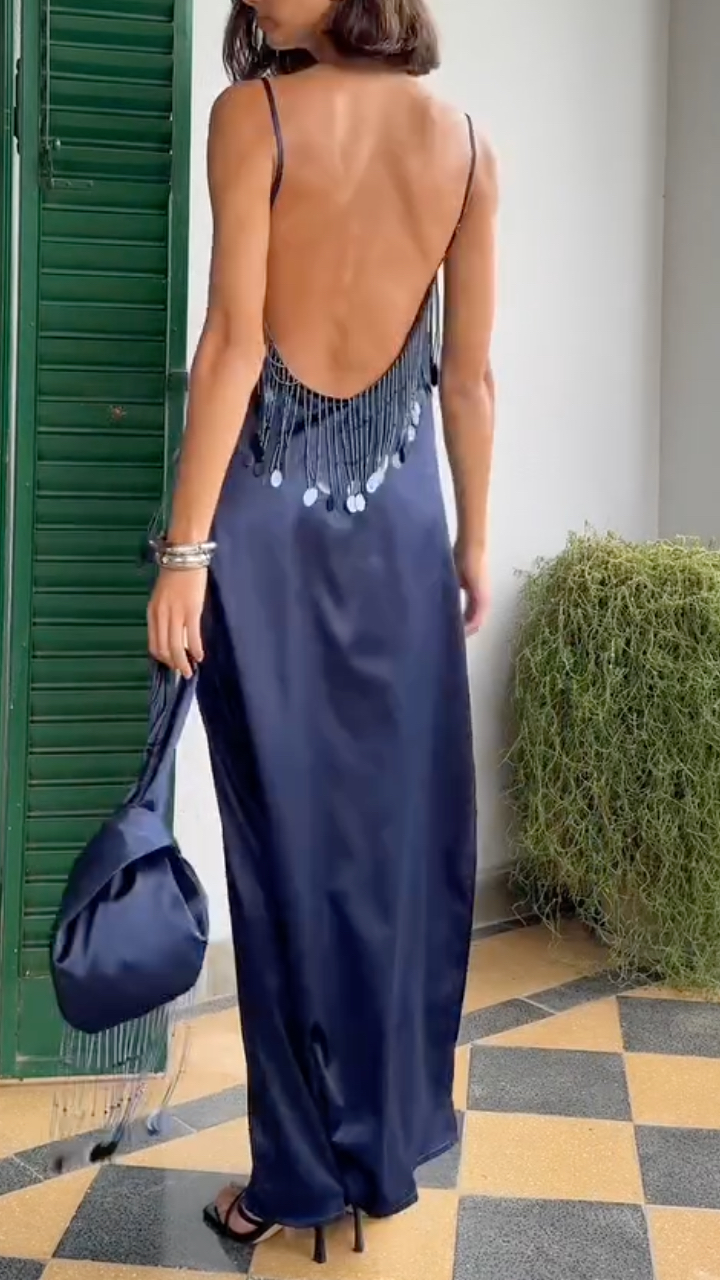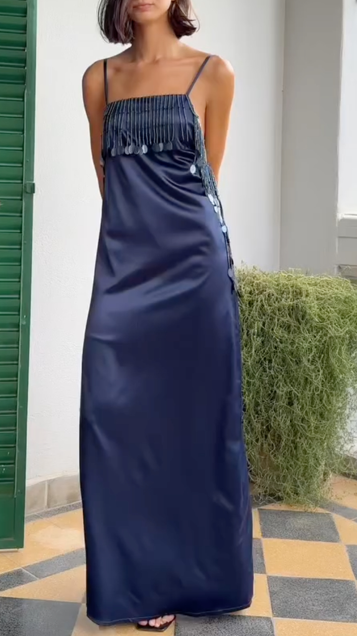 Navy Blue Satin Tassel Cami Maxi Dress