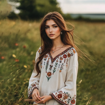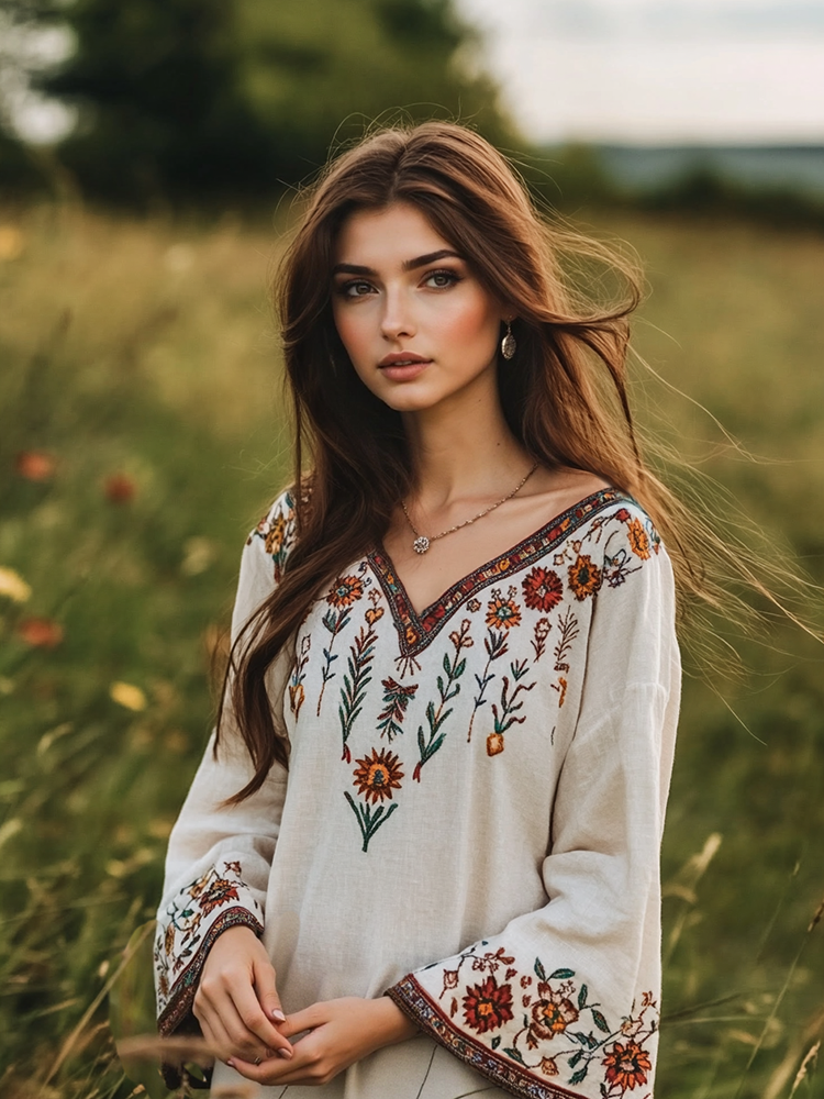 Retro Boho Floral Embroidery Art Linen Blend V-neck Blouse