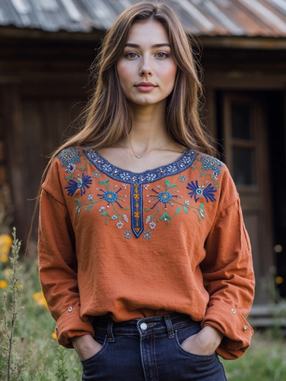 Vintage Bohemian Tribal Art Embroidery Print Cotton And Linen Loose Shirt