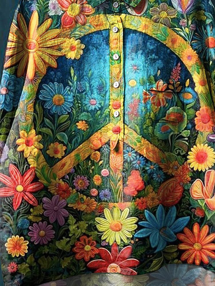 Vintage Peace And Love Floral Art Print Casual Cotton And Linen Shirt