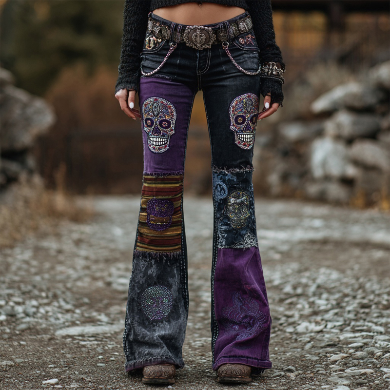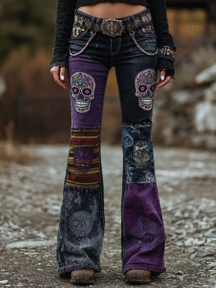 Vintage Skull Embroidered Patchwork Washed Bootcut Jeans