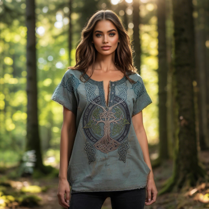 Vintage Viking Tree Of Life Rune Print V-neck Button Shirt