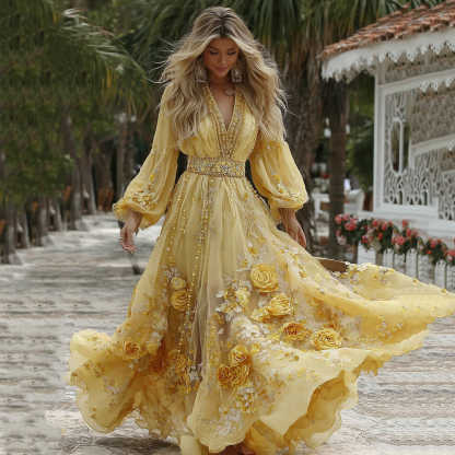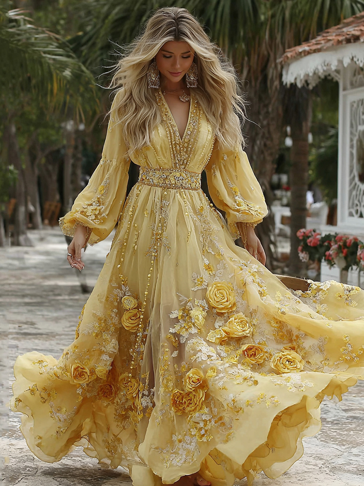 Women's Classic Yellow Roses And Floral Art Print V-neck Long Sleeve Maxi Dress