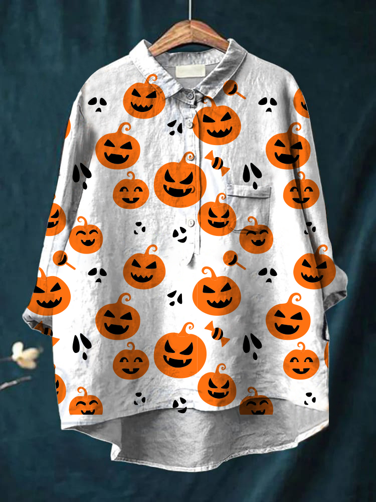 Women's Halloween Printed Casual Cotton And Linen Shirt