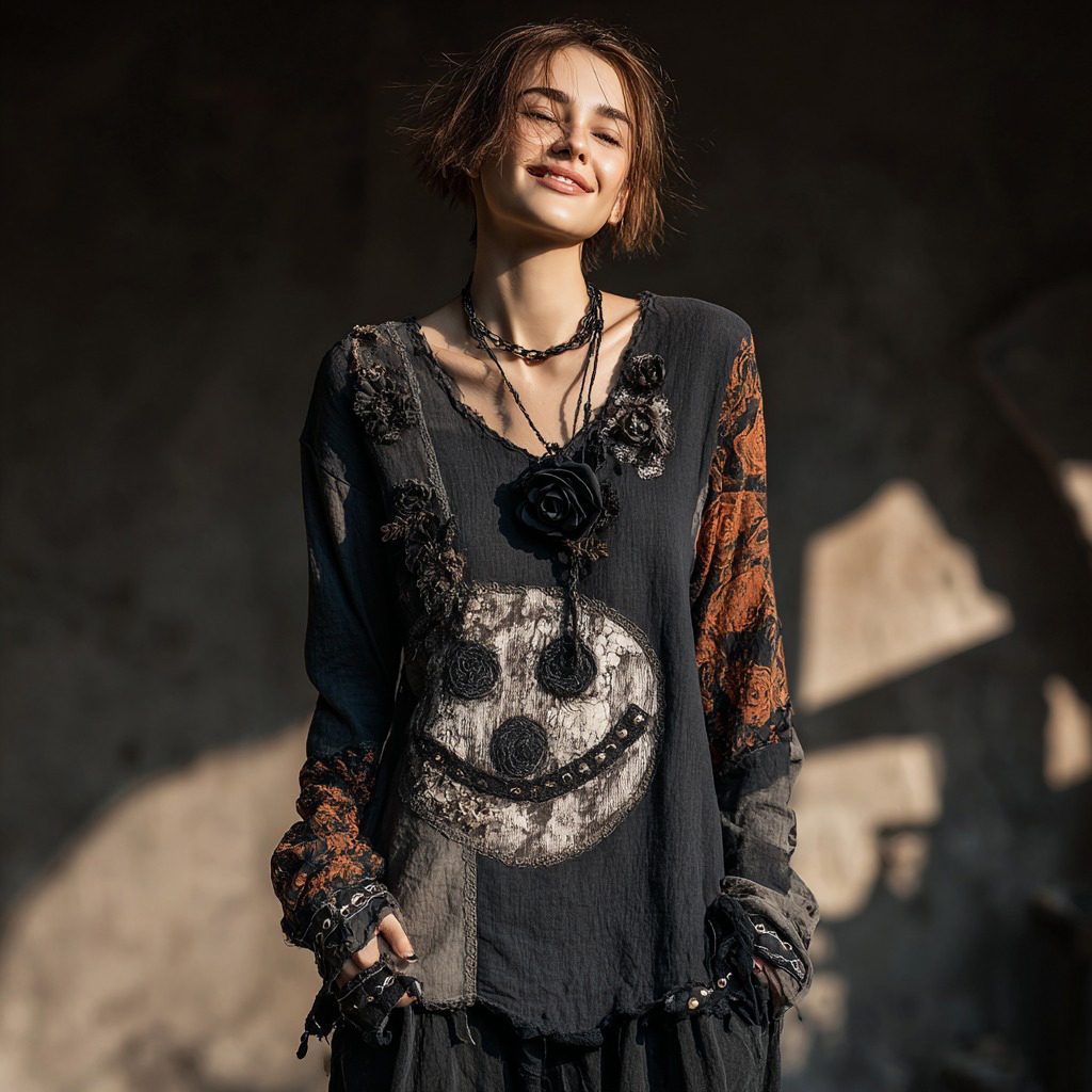 Women's Halloween Smiley Face And Rose Pattern V-neck T-shirt