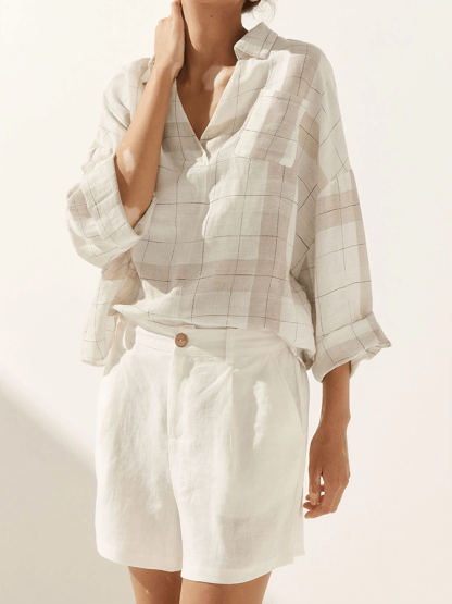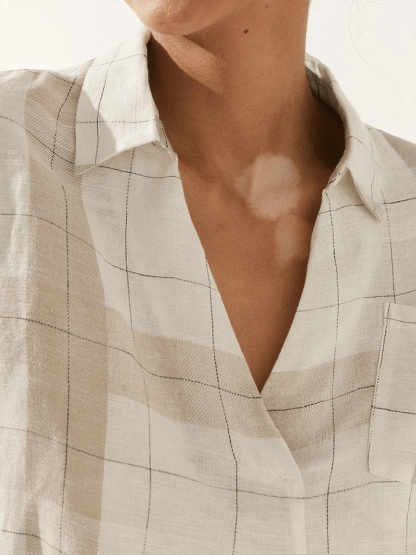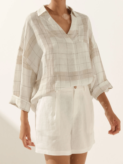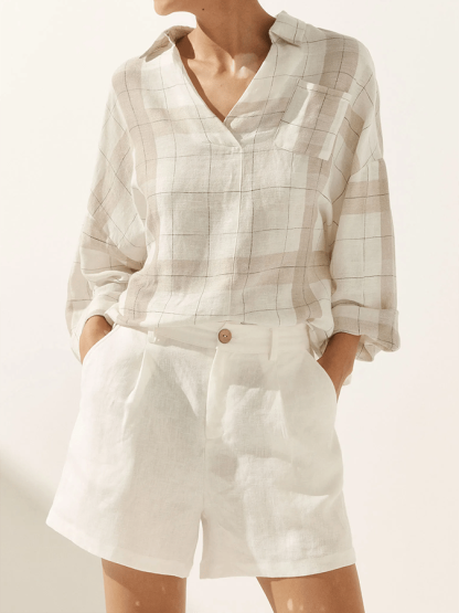 Women's Plaid V-Neck Pocket Patchwork Loose Casual Long-Sleeved Top