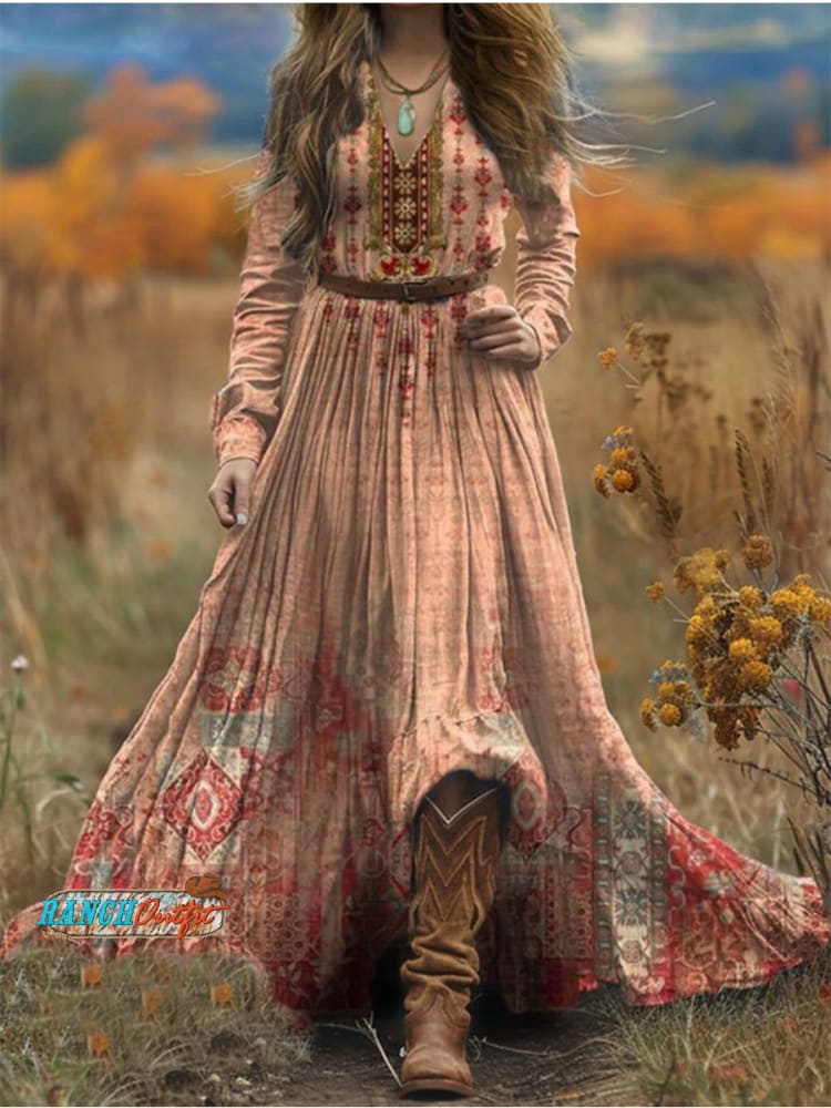 Women's Retro Floral Pattern Print Pocket Cotton Dress