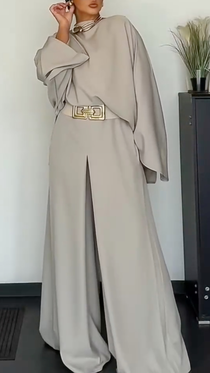 **Cut:** Ultra-loose fit featuring batwing (flared) sleeves, dropped shoulders, and an asymmetrical crossover hemline; designed to soften the lines of the shoulders and back, offering maximum figure-flattering coverage.