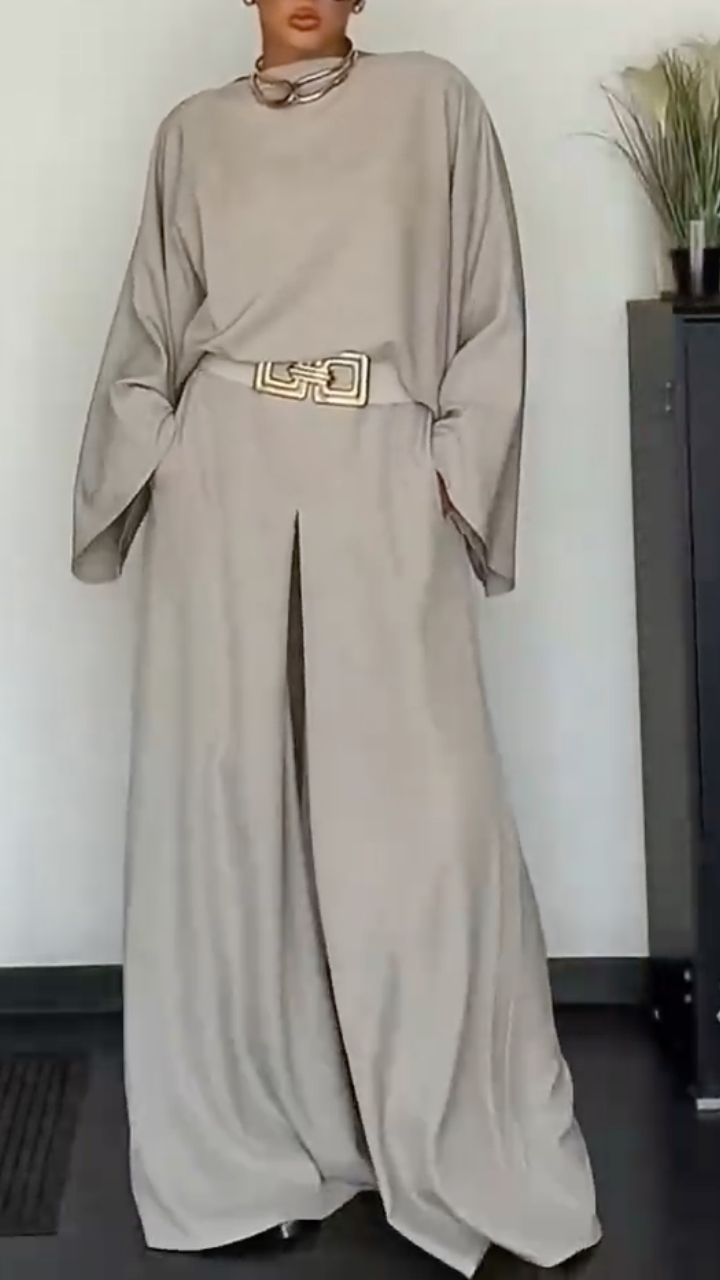 **Styling:** Paired with a wide belt featuring a square metal buckle to accentuate the waistline, balancing the loose fit of the garments and preventing a bulky appearance.