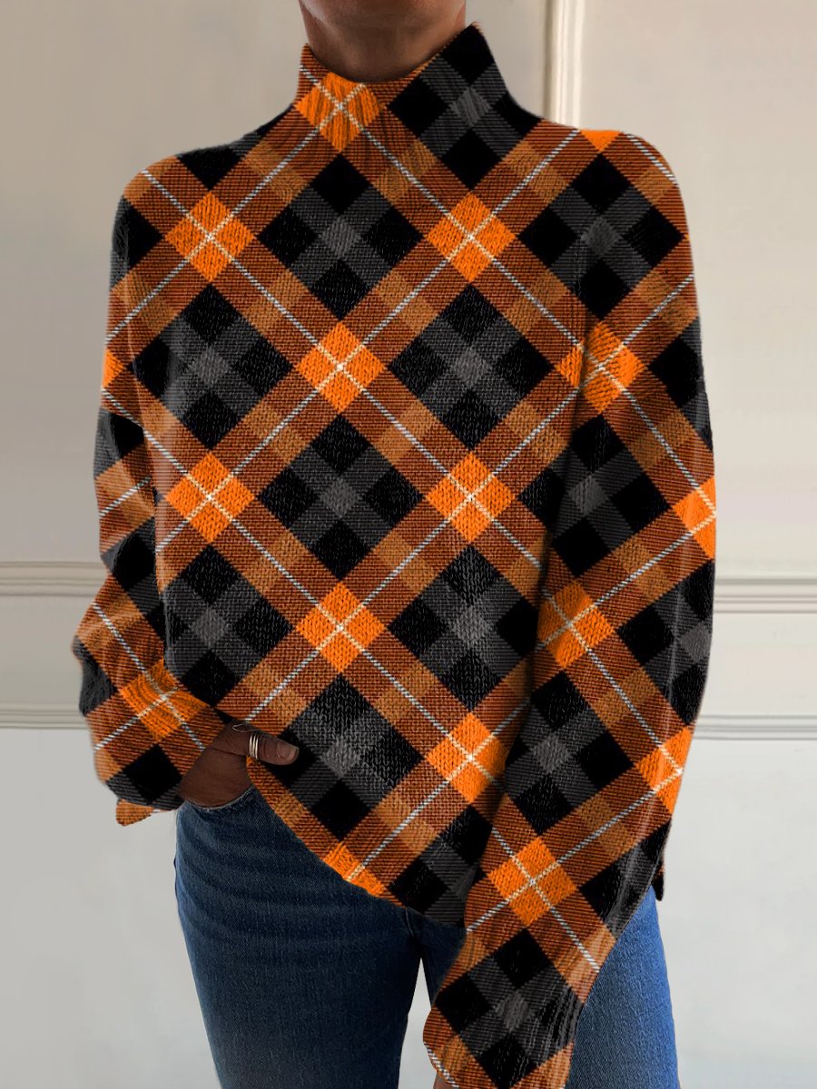 Fashion Retro Colorful Plaid Art Print Knit Turtleneck Pullover Sweater