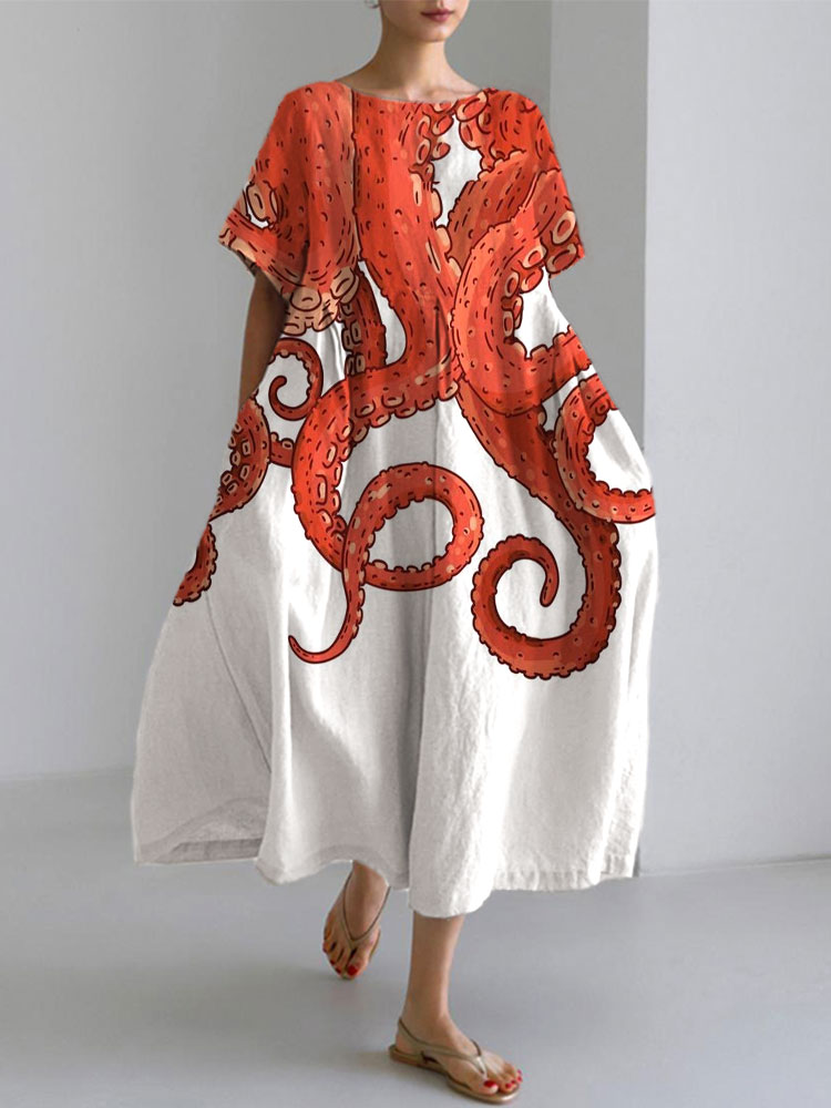 Japanese Art Ocean Octopus Print Cotton Blend Dress