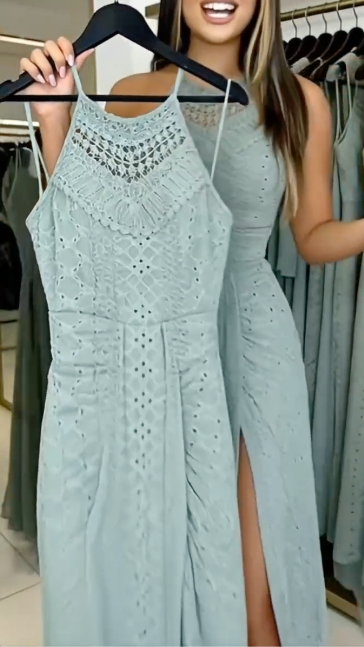 Design: Features a halter-style neckline that elegantly frames the shoulders and elongates the neck. A cutout panel at the bust adds a subtle touch of alluring sexiness. The skirt features a side slit that reveals a glimpse of the legs with every step, creating a look that is both dynamic and graceful.