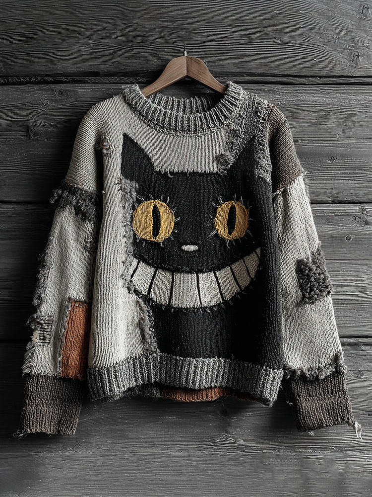 Unisex Halloween Black Cat Smile Face Contrast Stitched Cozy Knit Sweater
