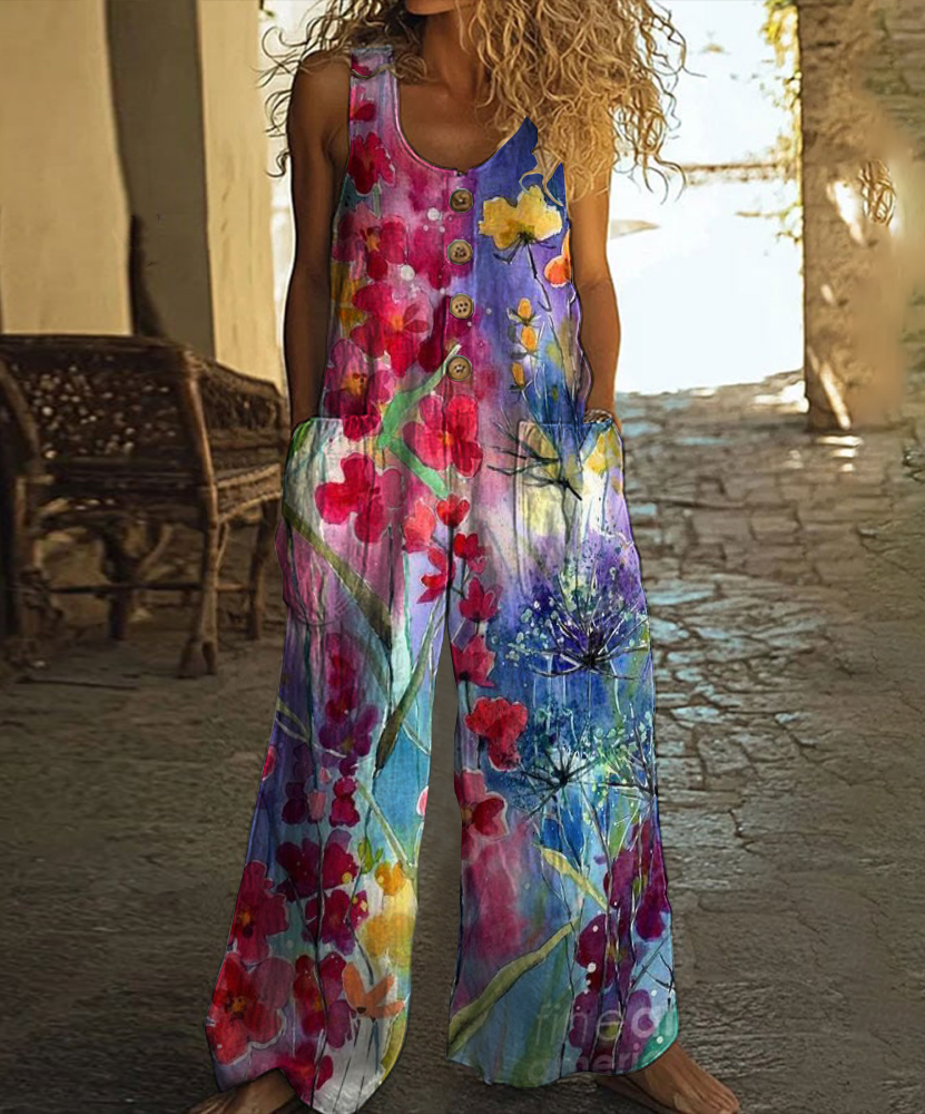 Vintage Floral Art Print Casual Wide Leg Jumpsuit