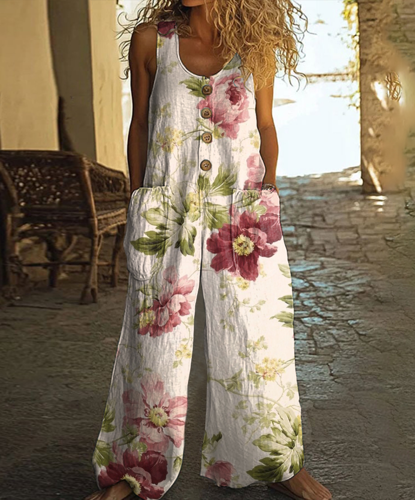 Vintage Floral Print Casual Wide-leg Jumpsuit
