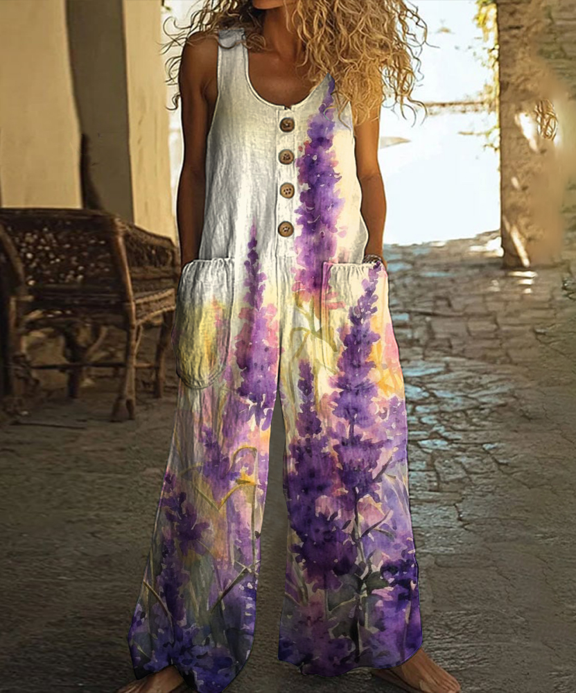 Vintage Lavender Print Casual Wide Leg Jumpsuit