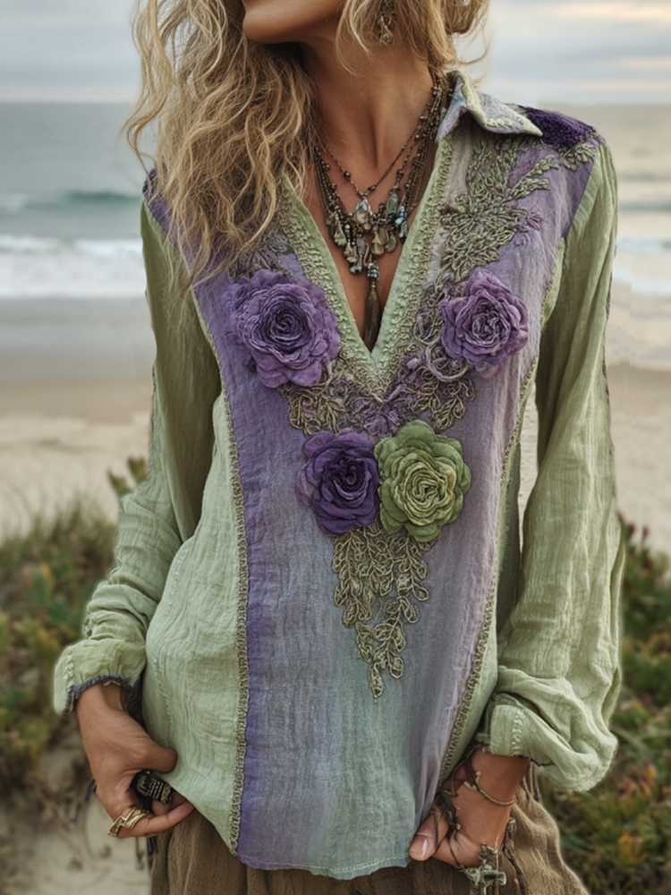 Vintage Purple Lavender And Floral Embroidered Linen V Neck Long Sleeve Shirt