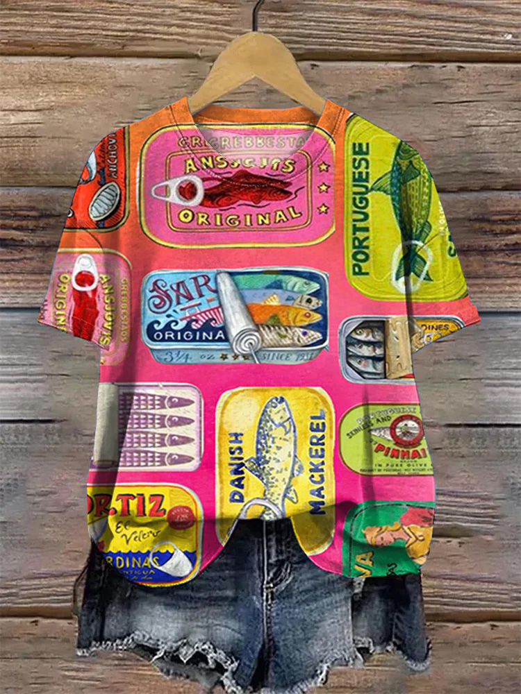 Vintage Sardines Can Print Round Sleeve Short Sleeve T-Shirt