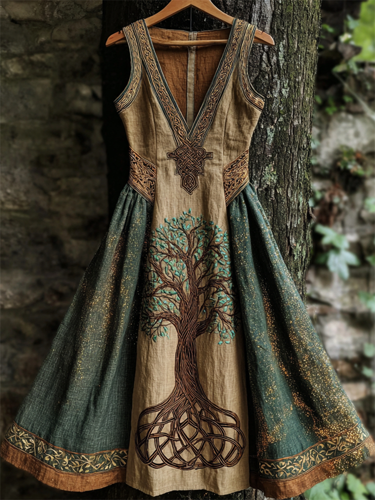 Vintage Tree Of Life Viking Glitter Sequins Contrast Linen Dress