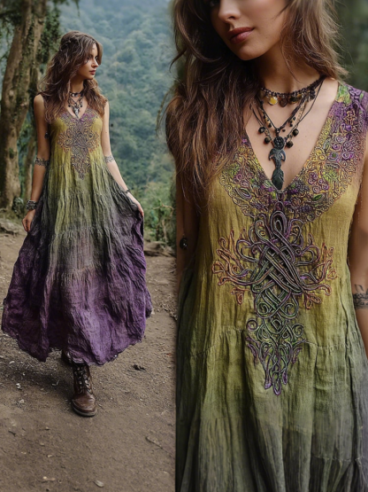 Vintage Viking Tribal Celtic Knot Art Linen V-neck Maxi Dress
