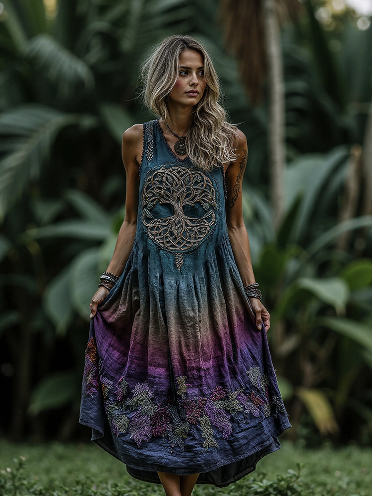 Vintage Viking Tribal Celtic Knot Art Linen V-neck Maxi Dress