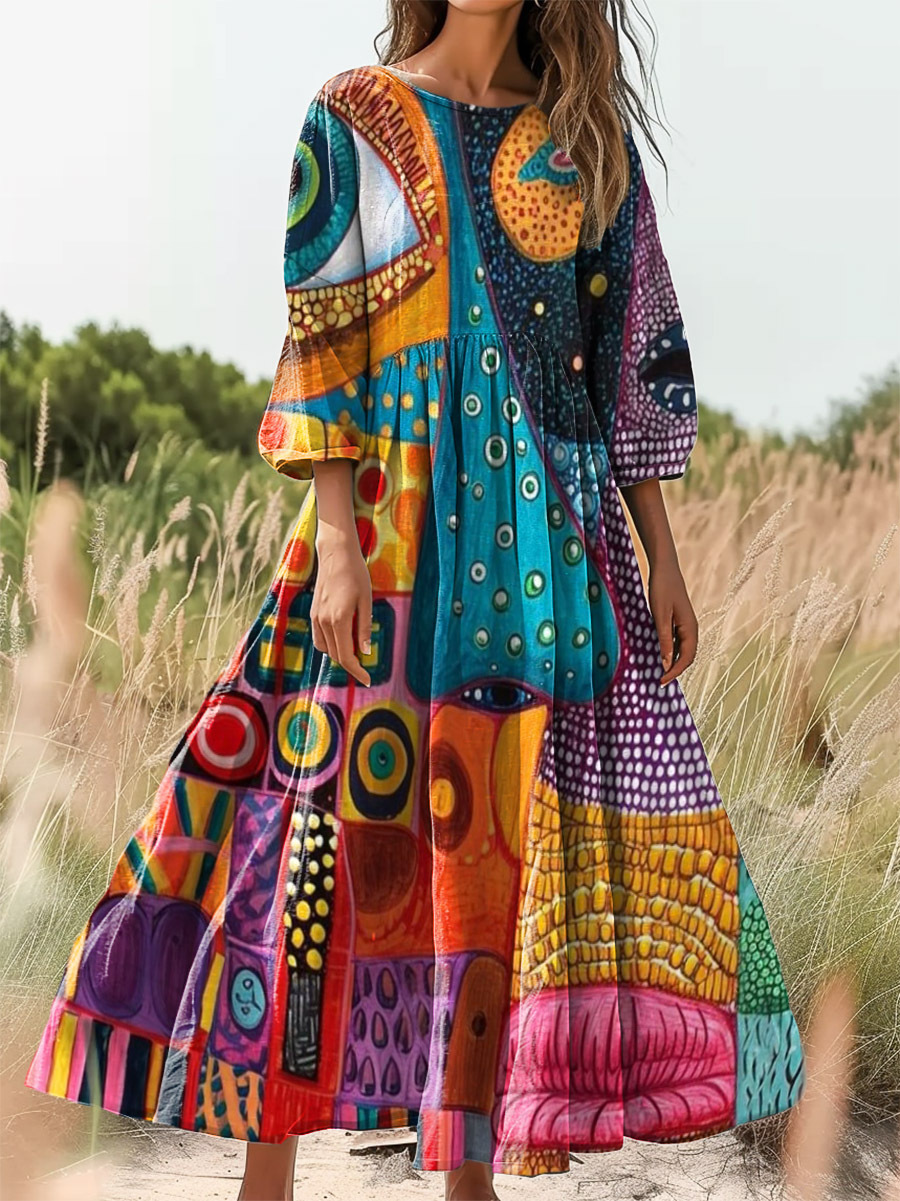 Women's Abstract Face Art Print Flowy Round Neck Cotton Pocket Dress