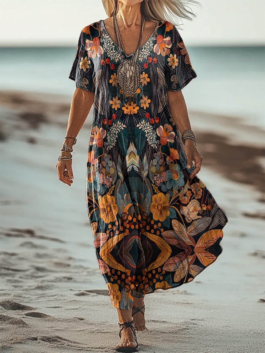 Women's Floral Art Patterns Art Print Short Sleeve Pocket Cotton Linen Dress