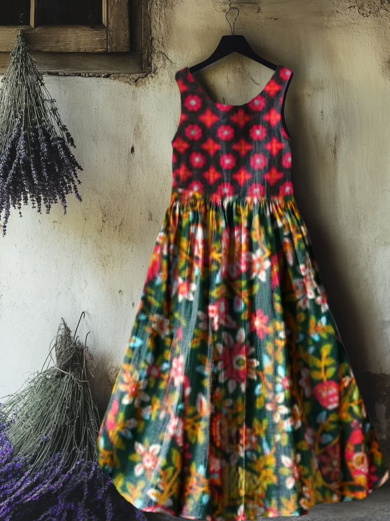 Women's Floral Art Print Sleeveless Cotton Pocket Dress