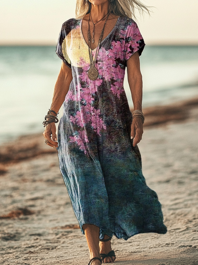 Women's Floral Pattern Art Print Pocket Cotton Dress