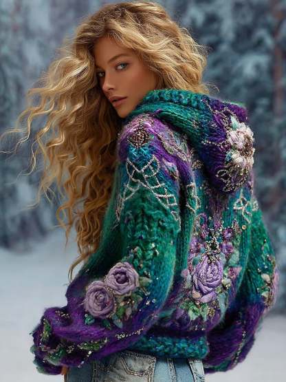 Women's Gradient Rose And Floral Knitted Warm Zipped Sweater