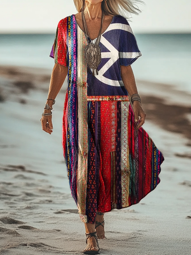 Women's Hippie Floral Patchwork Art Print Pocket Cotton Dress