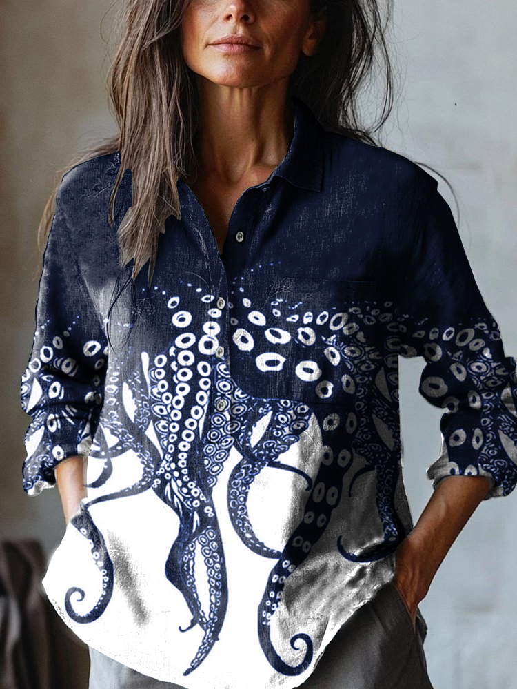 Women's Japanese Octopus Art Print Casual Cotton and Linen Shirt