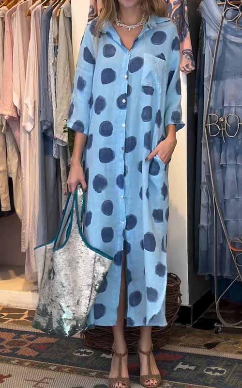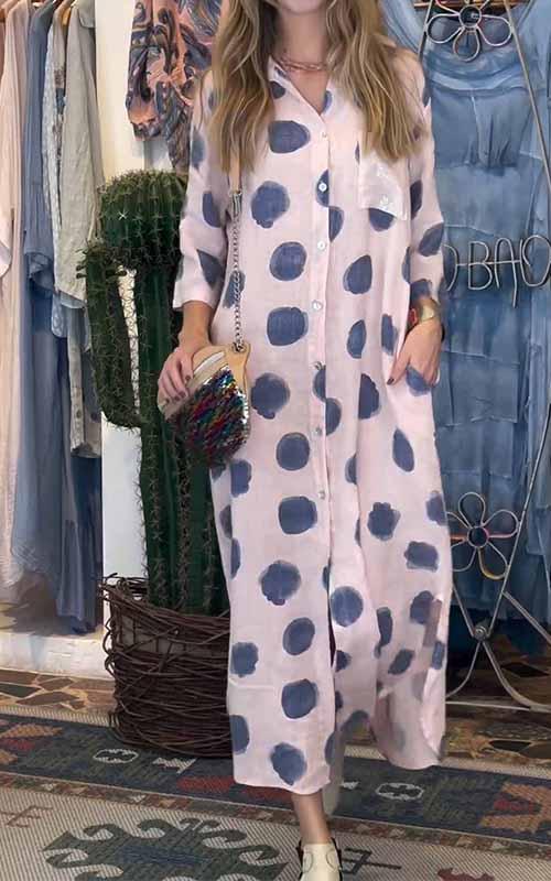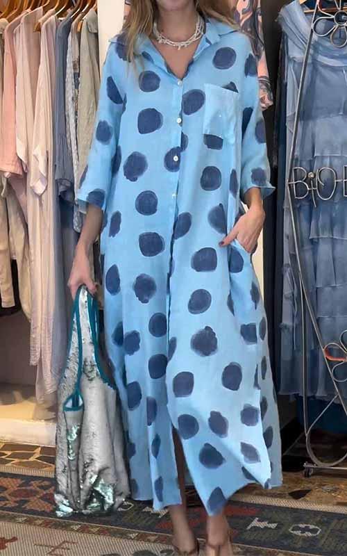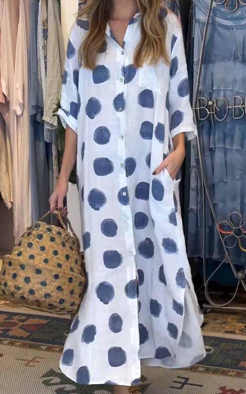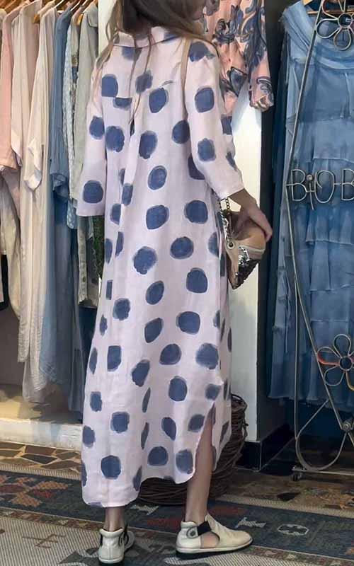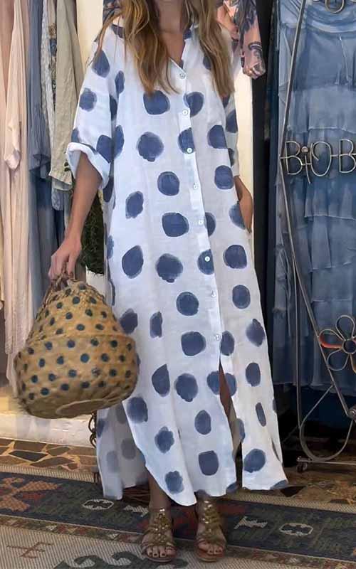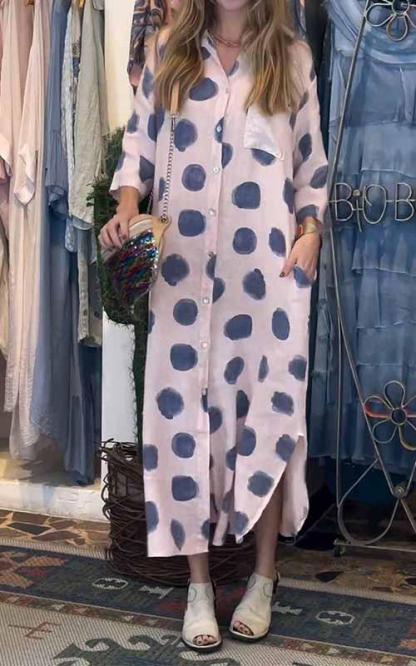 Women's Lapel Polka Dot Cotton and Linen Dress