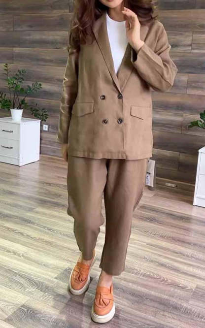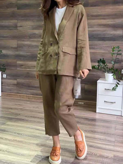 Women's Lapel Solid Color Cotton and Linen Two-piece Suit