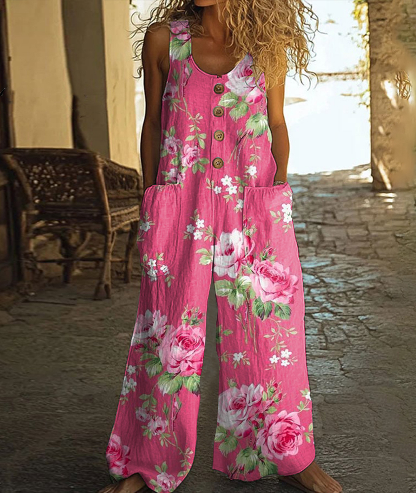 Women's Pink Rose Art Print Casual Wide Leg Jumpsuit