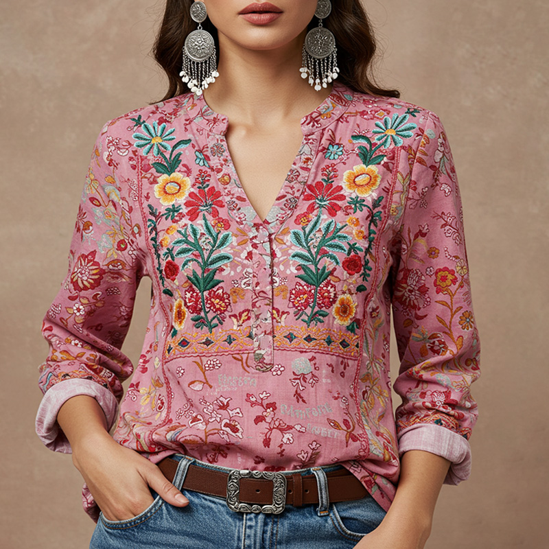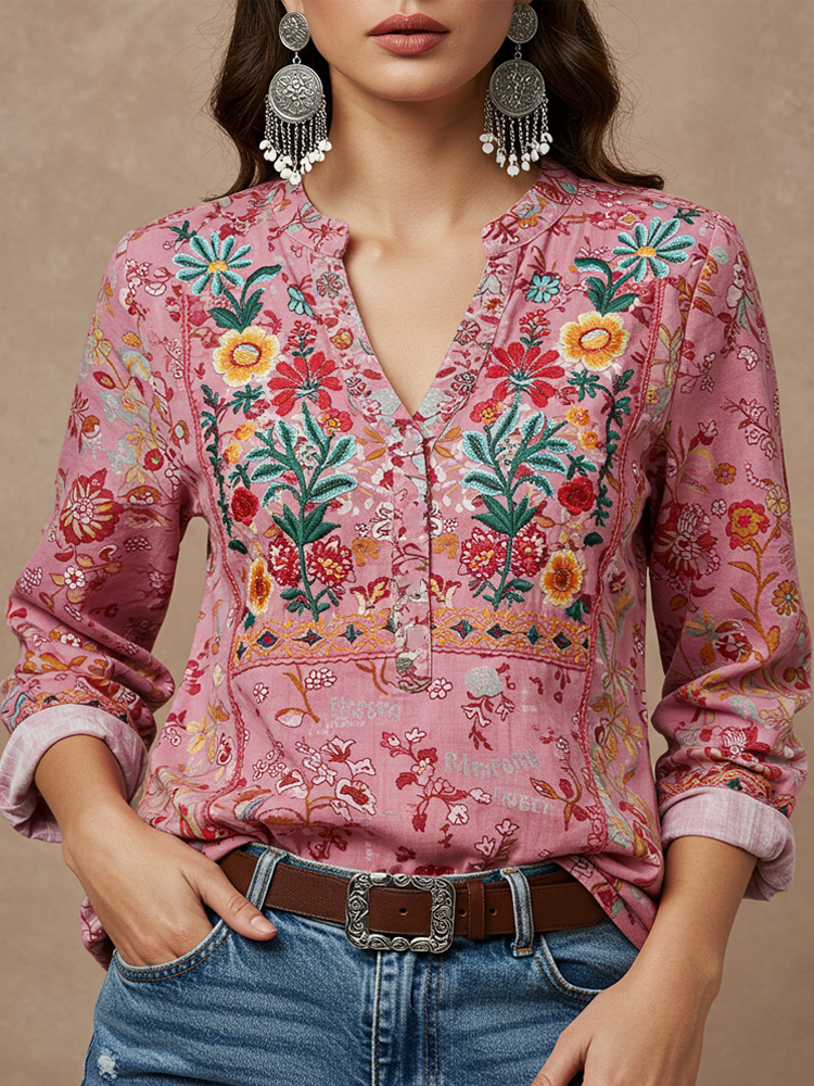 Women's Retro Pink Plant And Floral Embroidered Print T-shirt