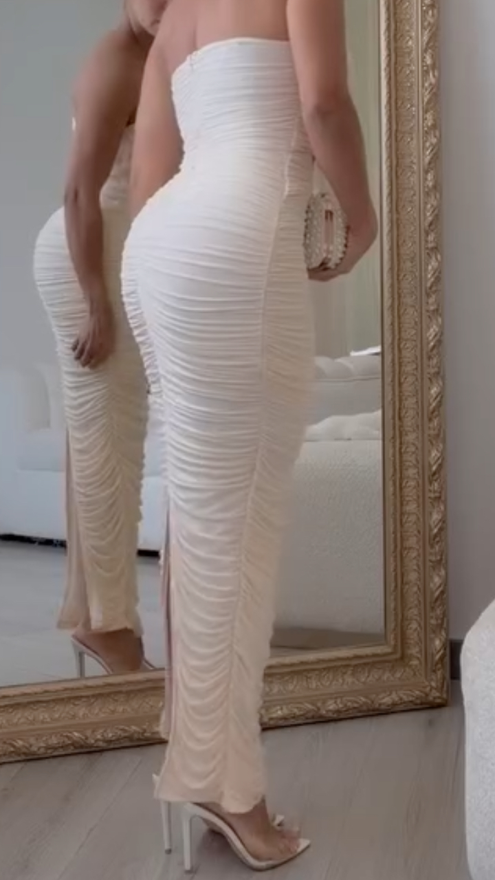 **Design:** Features a strapless bandeau neckline adorned with three-dimensional floral appliqués, adding a touch of sweet sophistication. The waistline incorporates a cutout and ruching design to flatter and sculpt the midsection, creating a slimming effect with visual depth. A side-slit hemline adds fluidity and movement to the silhouette.