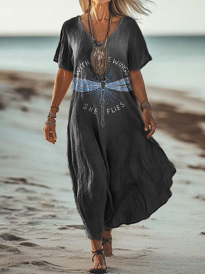 Women's Vintage Dragonfly Art Print Pocket Cotton Dress