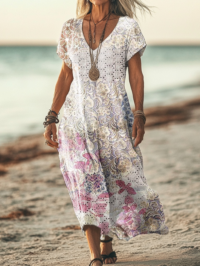 Women's Vintage Ethnic Floral Art Print Pocket Cotton Dress