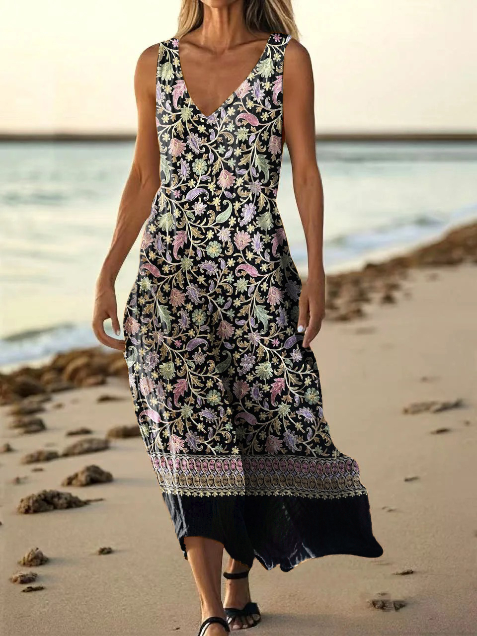 Women's Vintage Ethnic Floral Art Print Pocket Cotton Dress